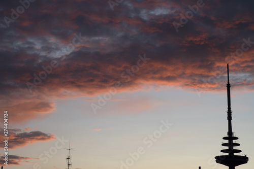 Dramatic red cloud formation of varying brightness in the sunset above a radio tower