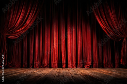 Dramatic red stage curtains create a theatrical backdrop with a wooden floor for performance arts events