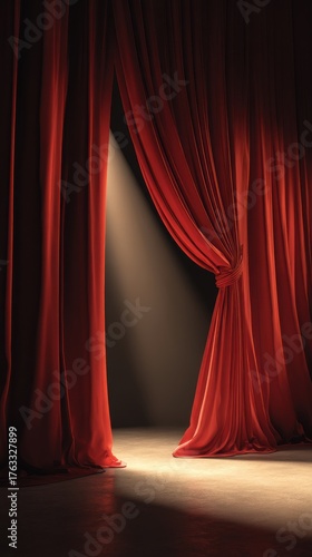 Dramatic Red Stage Curtains Opening with Spotlight on Empty Stage Floor Close-up Vertical Composition