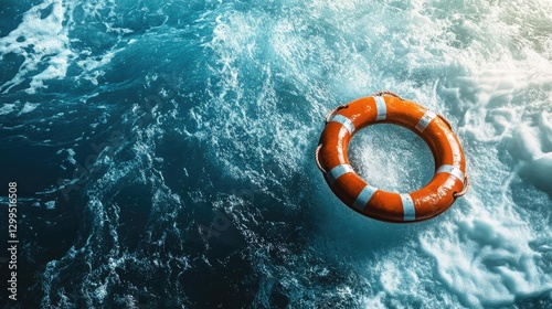 Dramatic Rescue Lifering Plunging into Turbulent Churning Waters Amid a Stormy Oceanic Backdrop Evoking Urgency and Survival