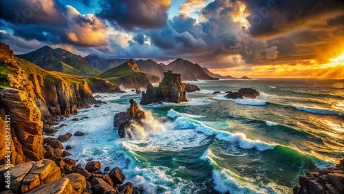 Dramatic Rocky Coastline, Mountainous Seascape, Ocean Waves Crashing on Rugged Cliffs - Stock Photo