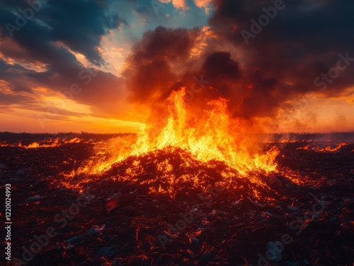 Dramatic Scene of a Burning Garbage Pile with Smoke Rising against a Vivid Sunset Sky