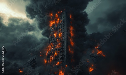 Dramatic scene of a burning skyscraper surrounded by thick black smoke, glowing flames and sharp debris textures creating an intense atmosphere, post-apocalyptic theme
