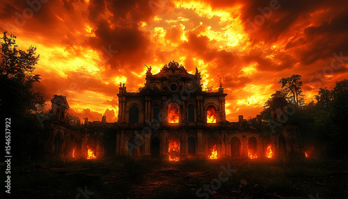 Dramatic scene of a grand, ruined building consumed by intense fiery flames under a stormy, clouded sky