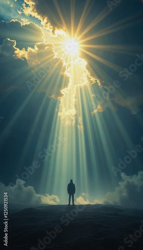 Dramatic scene of a lone figure beneath a glowing sunray surrounded by ethereal clouds