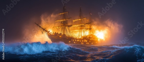 Dramatic Scene of an Abandoned Ship on Fire Navigating Through Turbulent Ocean Waves Under a Dark and Stormy Sky Creating an Atmosphere of Danger and Mystery