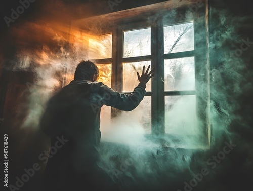Dramatic Scene of Man Desperately Attempting to Escape Raging Fire Through Window