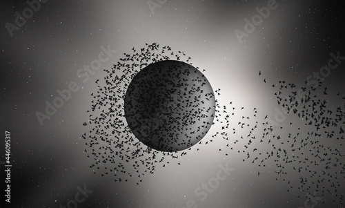 Dramatic scientific background - Total solar eclipse in dark glowing sky over silhouette birds flying and sunset sky