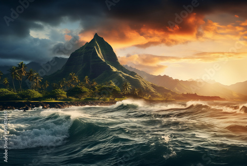 Dramatic Seascape with Mountain Peak at Sunset and Crashing Waves. Coastal Panorama with Mountain Silhouette, Vibrant Sunset Sky, and Powerful Waves Crashing Ashore.