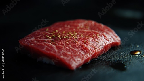 Dramatic Shot of Wagyu Sushi Topped with Thin Garnish