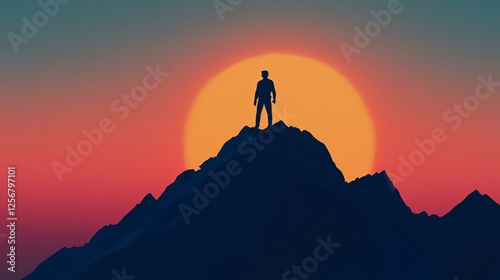 Dramatic silhouette of a man standing on mountain peak at sunrise