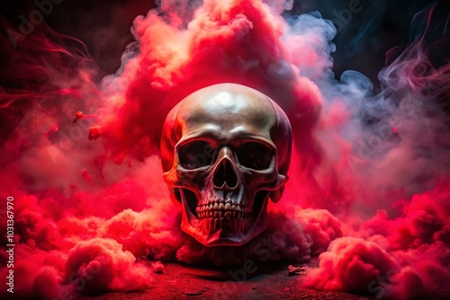 Dramatic Skull in Red Smoke - Surreal Photography for Eerie Atmosphere and Supernatural Themes