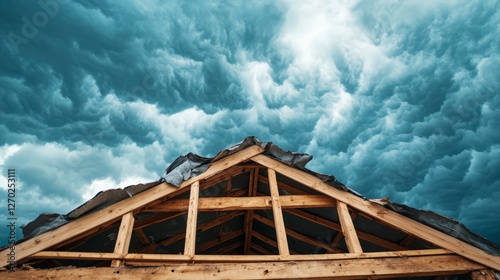 Dramatic Sky Over a Wooden Roof Structure with Dark Clouds and Atmospheric Tension