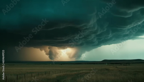 Dramatic sky over rural meadow, ominous storm cloud brings danger generated by AI