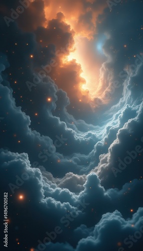 Dramatic Sky with Swirling Clouds and Glowing Orbs, Moody Celestial Scene for Dreamy Backgrounds