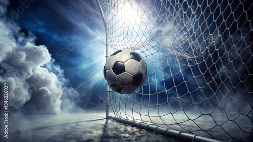Dramatic Soccer Goal Ball in Net with Smoky Atmosphere and Rays of Light