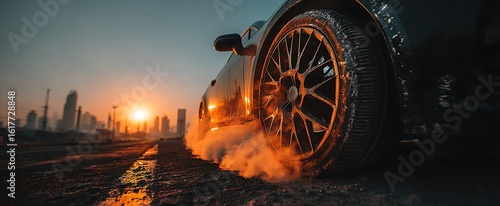 Dramatic Sports Car Drifting on Urban Road at Sunset with Smoke and Cityscape.