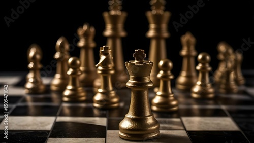 Dramatic Spotlight on Golden Chess King: A Symbol of Leadership and Strategy Amidst a Chess Game on a Checkered Board.
