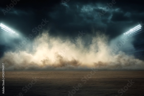 Dramatic Stadium Scene at Night with Dust and Smoke