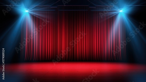 Dramatic Stage Setting with Illuminated Red Curtain Under Blue Spotlights for Theatrical Performances and Artistic Presentations