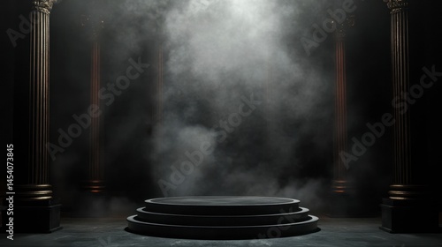Dramatic Stage with Smoke and Classical Columns in Dim Lighting
