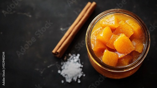 Dramatic still life of apricot preserves in glass jar with cinnamon stick and salt on deep black background, warm orange-yellow color contrast, natural directional light, minimalistic composition