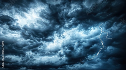 Dramatic storm clouds illuminated by lightning in a darkened sky.