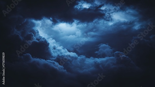 Dramatic storm clouds in deep blue, a sweeping skyscape with dynamic light, nature's raw power on display