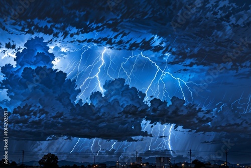 Dramatic stormy clouds with lightning striking over a dark landscape, symbolizing power, intensity, and the forces of nature.