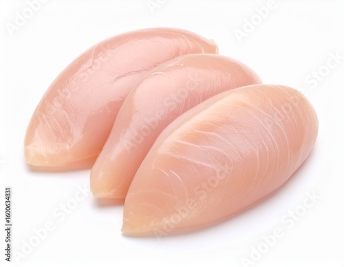 "Dramatic studio lighting on a freshly cut chicken breast, showcasing its texture and natural colors, set against a seamless white background. Ultra-detailed, cinematic food photography, full HD.