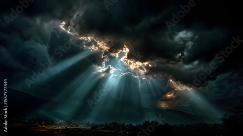 Dramatic Sunbeams Breaking Through Dark Storm Clouds Over Mountain Landscape perfect for environmental campaigns, cinematic backdrops, nature documentaries, spiritual themes weather-related content