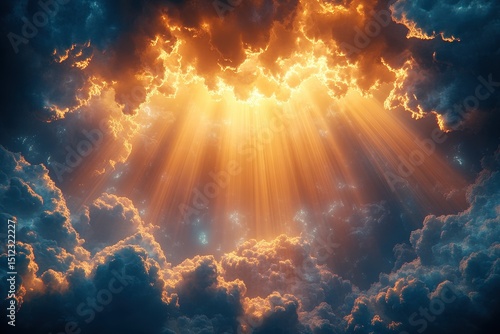 Dramatic sunlight breaks through clouds during twilight, illuminating the sky in warm golden tones