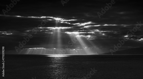 Dramatic Sunlight Rays Piercing Through Dark Clouds Over a Vast Ocean at Dawn