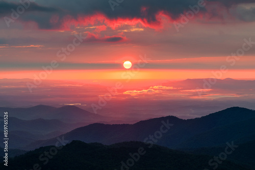 Dramatic sunrise over layered ridges in the Blue Ridge Mountains of North Carolina