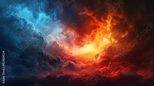 Dramatic sunset clouds with vibrant orange and blue hues over a tranquil landscape