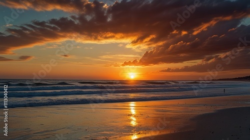 Dramatic sunset over a beach, with colorful clouds and waves.