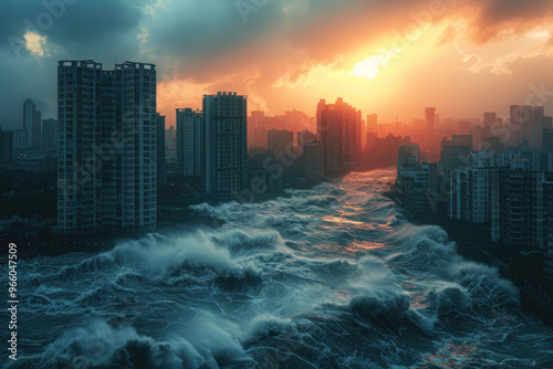 Dramatic Sunset Over City Skyline with Ocean Waves Crashing into Shoreline