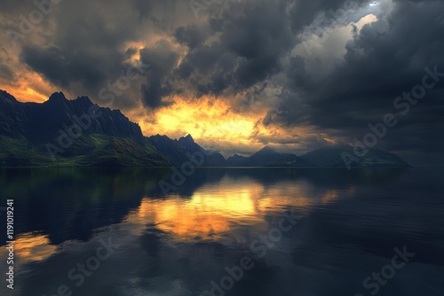 Dramatic sunset over peaceful lake surrounded by towering mountains and turbulent clouds in a serene landscape
