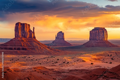 Dramatic sunset over sandstone buttes. Vast, colorful desert landscape