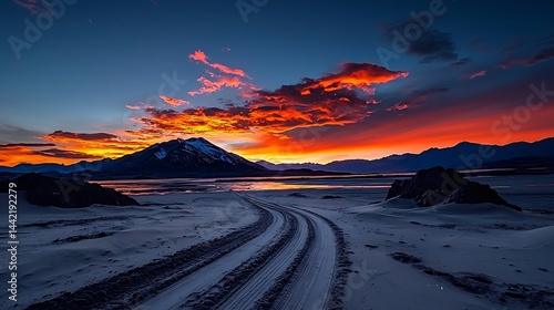 Dramatic sunset over snowy desert mountains