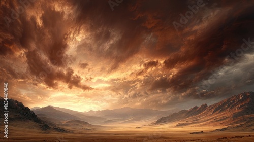 Dramatic Sunset Over Vast Desert Landscape with Colors of Red, Orange, and Purple in the Sky and Mountains in the Background