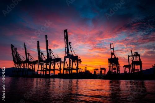 Dramatic sunset paints the sky above a bustling port filled with towering cranes and cargo.