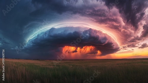 Dramatic sunset storm over grassy plains.