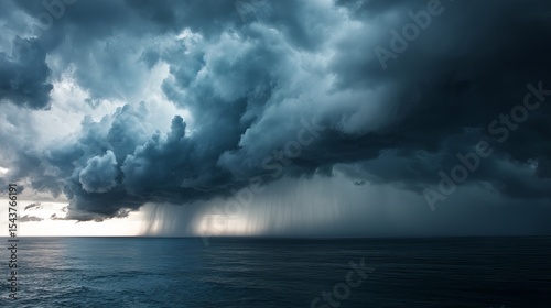 Dramatic thunderstorm clouds and heavy rainfall over dark ocean horizon
