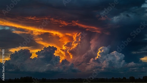 Dramatic thunderstorm clouds lit by a fiery sunset sky. Vibrant contrast of orange and blue tones creates a powerful and atmospheric landscape scene.