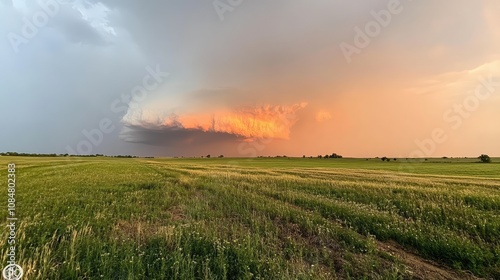 Dramatic Thunderstorm Scene Over Green Prairie at Sunset with Colorful Cloud Formation and Vast Open Sky Captured in Gorgeous Landscape Photography