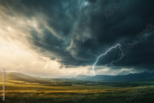 Dramatic Thunderstorm Sky over Serene Green Field with Lightning Striking Mountains in the Background