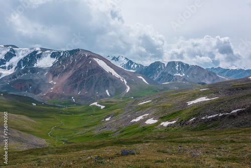 Dramatic view from grassy stony hill with flowers to beautiful green alpine valley, big snowy range and part of mountain with snow-capped sharp pinnacle far away in center under rain gray cloudy sky.
