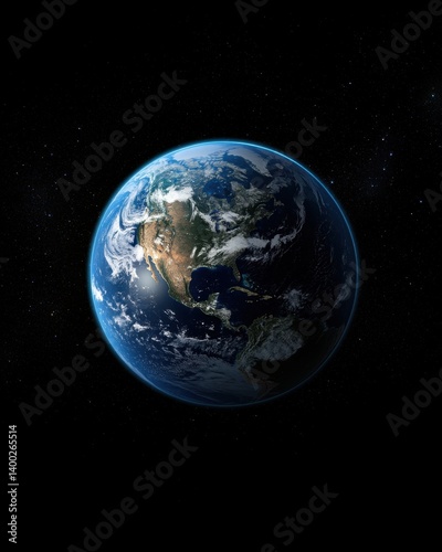 Dramatic view of planet earth in space with visible north america under sunlight and cloudscape in cosmic blackground