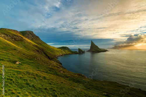 Drangarnir rock seen from the green hills along the hiking trail, Vagar island, Faroe Islands, Denmark